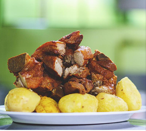 6 piezas de chicharrón con papas, mote y ensalada.
