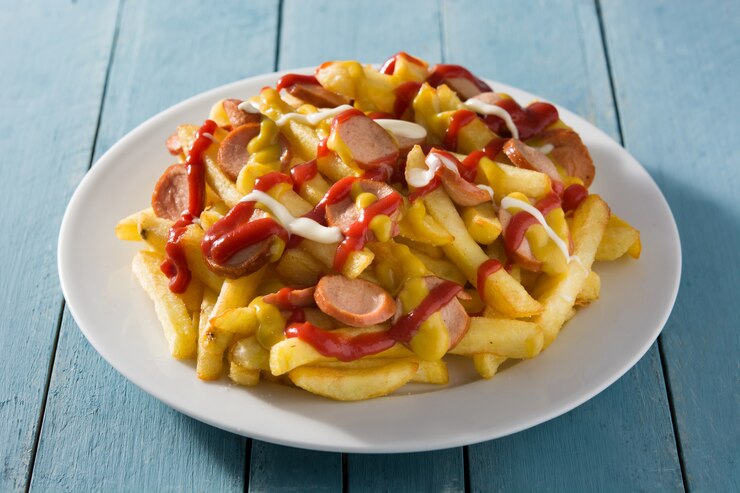 Papas fritas acompañadas de salchicha y cremas de la casa